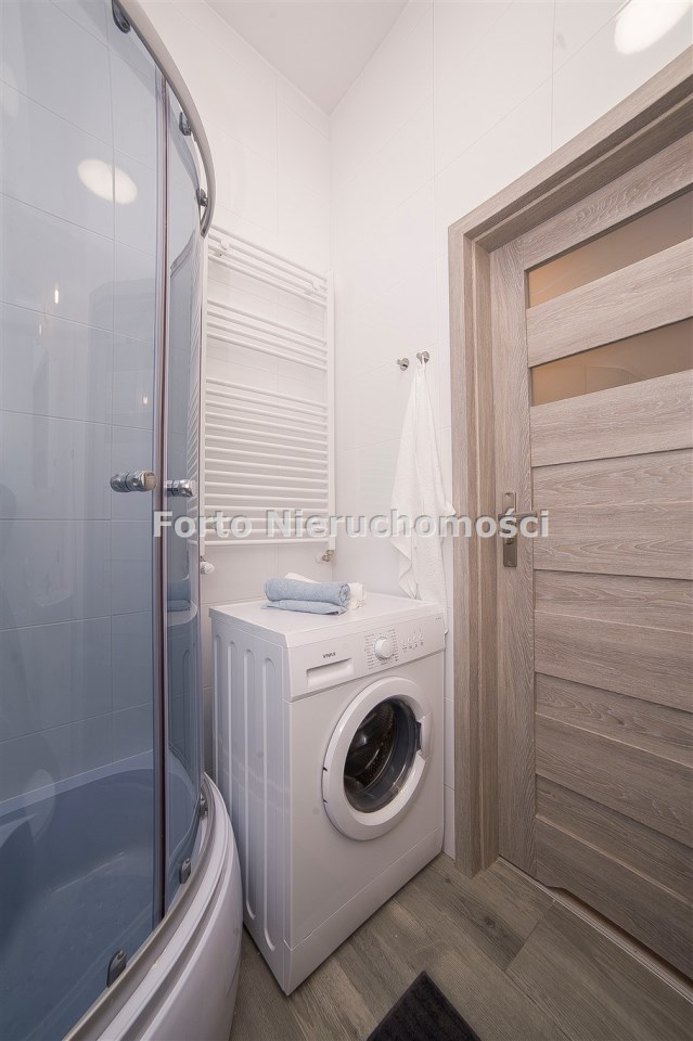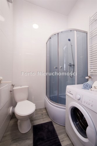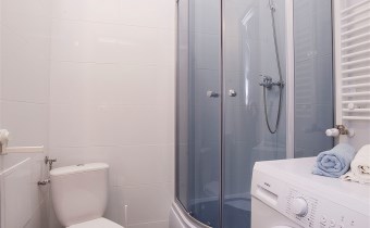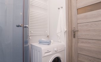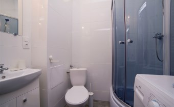 Łazienka wyposażona jest w kabinę prysznicową, pralkę, umywalkę z szafką, lustro, WC.