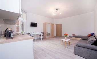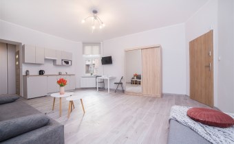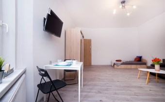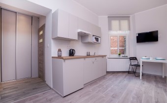 Aneks kuchenny wykonany zabudowie, wyposażony w małą lodówkę, płytę indukcyjną, mikrofalówkę oraz podstawowe naczynia kuchenne. W części mieszkalnej znajdują się dwa jednoosobowe tapczany, stół z krzesłami, telewizor, szafa ubraniowa oraz dodatkowa szafa w zabudowie między pokojem a łazienką.