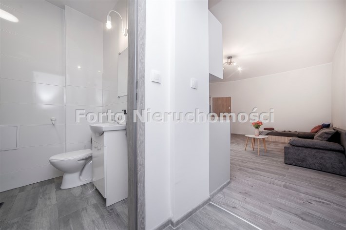 Lokal składa się z pokoju z aneksem kuchennym, przedpokojem z zabudowaną szafą oraz łazienki z WC.