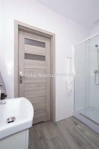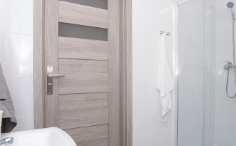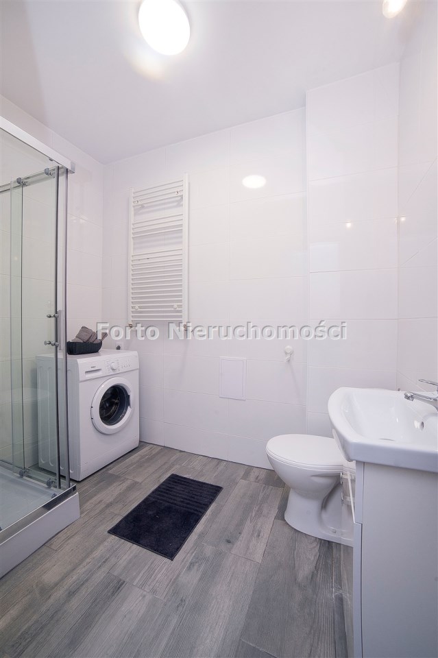Łazienka wyposażona jest w kabinę prysznicową, pralkę, umywalkę z szafką, lustro, WC.