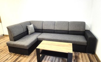 W salonie znajduje się rozkładana sofa, stanowiąca funkcjonalne miejsce do wypoczynku, stolik kawowy oraz komoda.