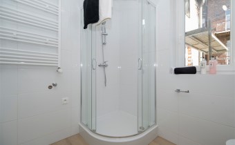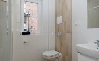 Łazienka z oknem, wykończona w jasnych kaflach, wyposażona w kabinę prysznicową, umywalkę, podwieszaną toaletę oraz pralkę.